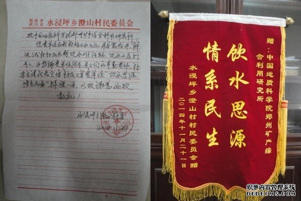 该孔的实施,得到了澄山村村委领导及村民的大力支持,为了感谢郑州综合所野外工作人员的辛勤劳动,澄山村村委代表村民赠予“饮水思源,情系民生”锦旗一面以表达感激之情。