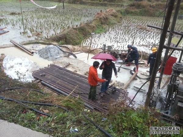 技术人员和施工队员在克服雨季带来的不便和岩石破碎等技术困难的前提下,完成了布置于武冈市水浸坪乡澄山村ZK001孔的钻探任务,并取得了良好的效果。该孔孔深133m,涌水量达148.6m3/d,基本上解决了澄山村缺水区域老百姓的饮水问题,使当地百姓告别了靠扁担挑水的年代。