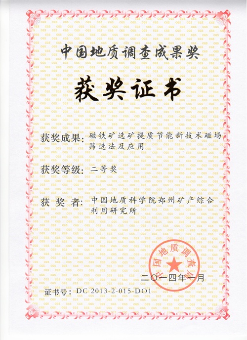 郑州综合所“磁铁矿选矿提质节能新技术磁场筛选法及应用”成果获2013年中国地质调查成果奖二等奖。