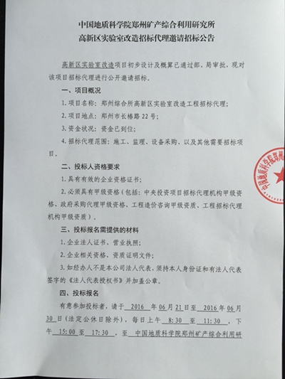 中国地质科学院郑州矿产综合利用研究所高新区实验室改造招标代理邀请招标公告