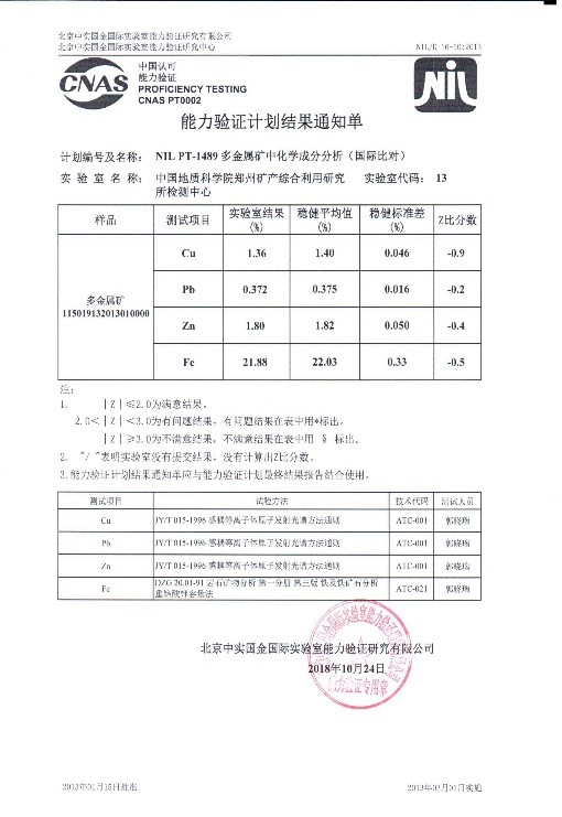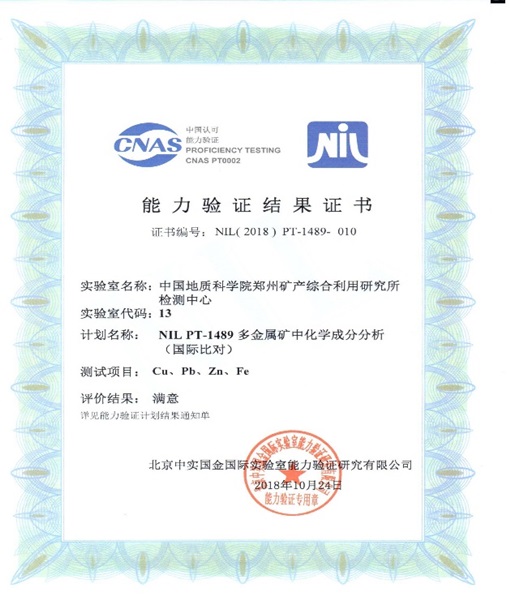 10月,自然资源部中国地质调查局郑州矿产综合利用研究所检测中心参加了北京中实国金国际实验室能力验证研究中心组织实施的“NIL PT-1489多金属矿化学成分分析(国际比对)能力验证”,铜(Cu)、铅(Pb)、锌(Zn)、铁(Fe)四种化学成分的结果评价均为“满意”。
