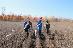 十月初的多宝山最低气温已经低至零下8度,寒风刺骨,水面已开始结冰,野草早已枯黄,冰封期即将来临。为了圆满完成“黑龙江多宝山铜矿集中开采区地质环境调查”项目全年野外调查工作,地质灾害调查、野外样品采集及加工、土壤动态监测等工作正按计划有条不紊地进行。