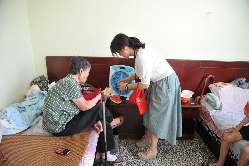 志愿者服务队一行8人来到敬老院,了解了老人的生活和身体情况,为老人们送去了牛奶、蛋糕、西瓜等慰问品,并帮助敬老院工作人员搬运了瓜果、蔬菜等。在敬老院娄院长的带领下,志愿者把切好的西瓜、蛋糕等食品送到了每一个房间每一位老人手里,并与他们聊天、谈心。老人们对于志愿者的到来感到十分开心,活动期间,敬老院里到处是欢声笑语。