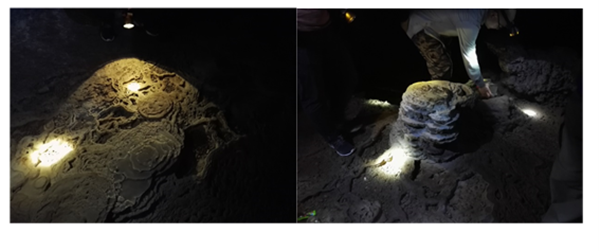 此外,该处地面上有大量的现代泥土沉积在崩塌岩块的顶面,由于上部滴水的作用,形成大量类似于漏斗的现象,该现象说明,洞顶距离地表已经非常近,下渗的地表水携带大量的泥土已经开始进入洞穴。根据洞穴延伸方向和距离判断,该处地表可能为地表沟谷的底部。该大厅的西北部位一深达5米以上的洼地。