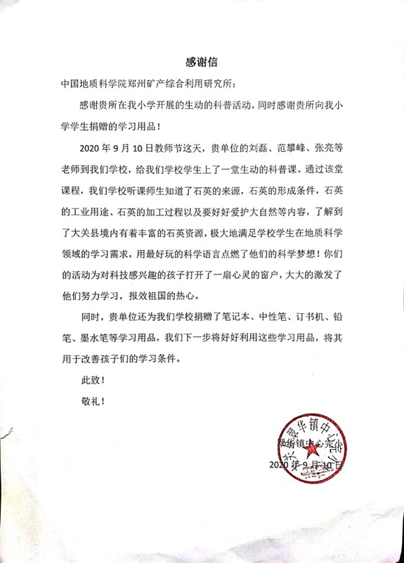 通过本次科普,科普人员向大关县山区学校师生宣讲了石英的来源、形成条件、工业用途、加工过程以及要好好爱护大自然等内容,普及了大关县境内有着丰富的石英资源,极大地满足学校师生在地质科学领域的学习需求,用最通俗易懂的科学语言点燃了他们的科学梦想!为对科技感兴趣的孩子打开了一扇心灵的窗户,大大的激发了他们努力学习,报效祖国的决心。同时,郑州综合利用所还向学校捐赠了笔记本、钢笔、铅笔、订书机等学习用品,改善贫困山区学生的学习条件。