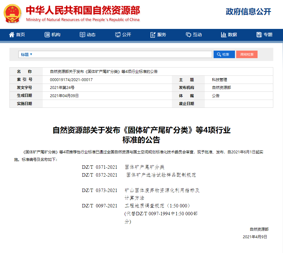 近日,自然资源部发布公告,中国地质调查局郑州矿产综合利用研究所主持编制的《固体矿产尾矿分类》(DZ/T 0371-2021)、《固体矿产选冶试验样品配制规范》(DZ/T 0372-2021)、《矿山固体废弃物资源化利用指标及计算方法》(DZ/T 0373-2021)等三项标准获准发布,自2021年6月1日起实施。