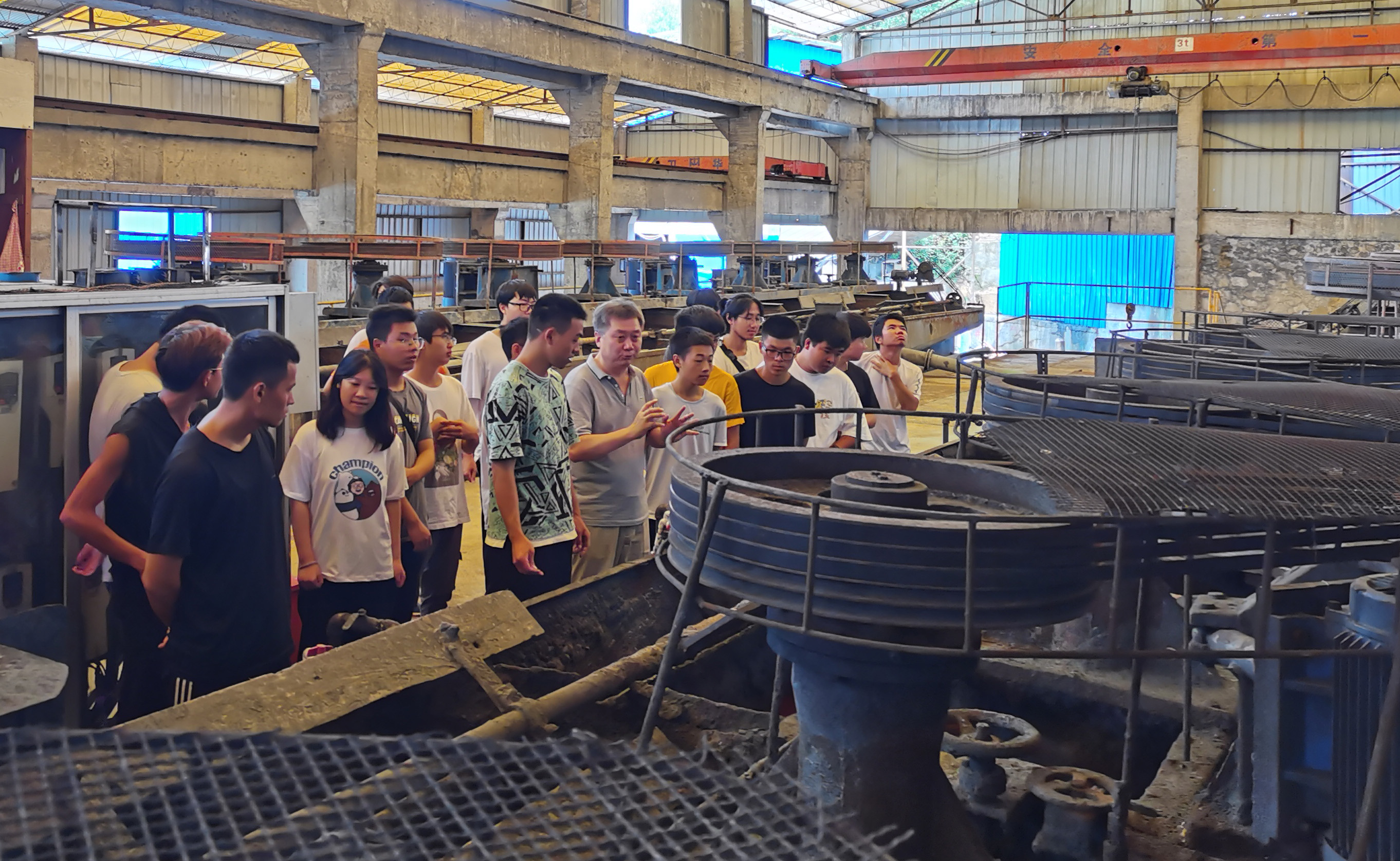 项目组选矿专家李迎国研究员,结合矿山矿种类型、共伴生资源特点,选矿回收工艺流程等方面,分批为参加活动的86名国土资源调查与管理专业师生开展了一场别开生面的现场教学。