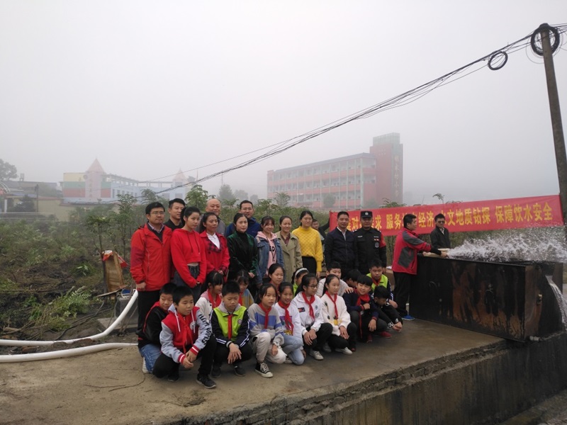 项目结合当地政府实际需求,通过物探、钻探等工作手段,部署实施了水文地质钻孔。日前,在腊市小学、胡家坊小学成功实施探采结合井2口,其中胡家坊小学水文地质钻孔日涌水量530m3/d,解决了当地师生约1600人的生活用水问题,旱季宜可保障附近村民的生活用水问题,有效服务地方水资源管理。胡家坊小学师生送来了“赣西大地话水环、找水建井惠民生”的感谢锦旗。