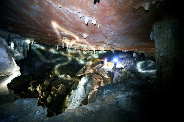 该大厅沿30度方向渐渐地变成狭窄的通道,并有大量的崩塌岩块,大约30米左右处,变得极其狭窄,因岩块堵塞无法继续前行。