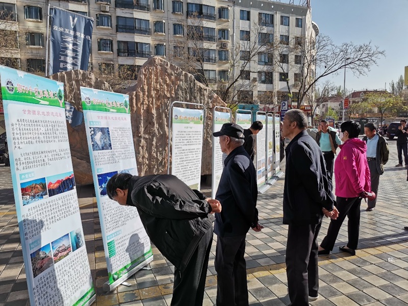 在祖国西北重镇酒泉市,依托“东天山昌吉-双沟山地区区域地质调查(郑州综合利用所)”项目成果举办了科普宣传活动。科普人员通过制作主题展板、发放知识海报及宣传彩页、悬挂横幅、向民众发放环保购物袋等方式,向社会民众普及了西北地区地球科学知识及矿产资源概况,并对酒泉地区丹霞地貌、硅化木、恐龙化石、冰川等地质遗迹进行了现场讲解。丰富多彩的宣传活动吸引了当地社会民众的积极参与。