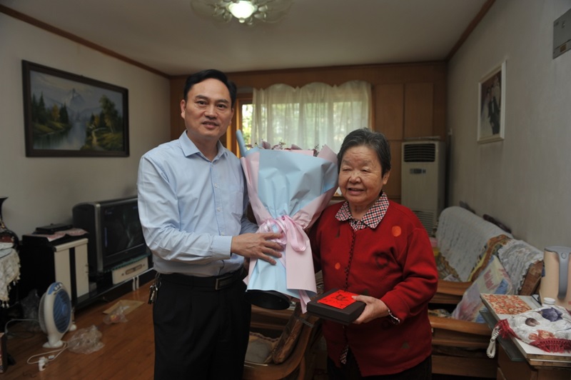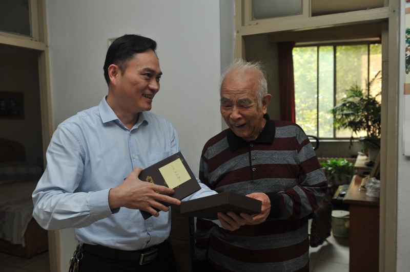 在离休干部王志学和余彬家,郭珍旭为他们送上了由中共中央、国务院、中央军委联合颁发的 “庆祝中华人民共和国成立70周年”纪念章,并送上鲜花和慰问金。