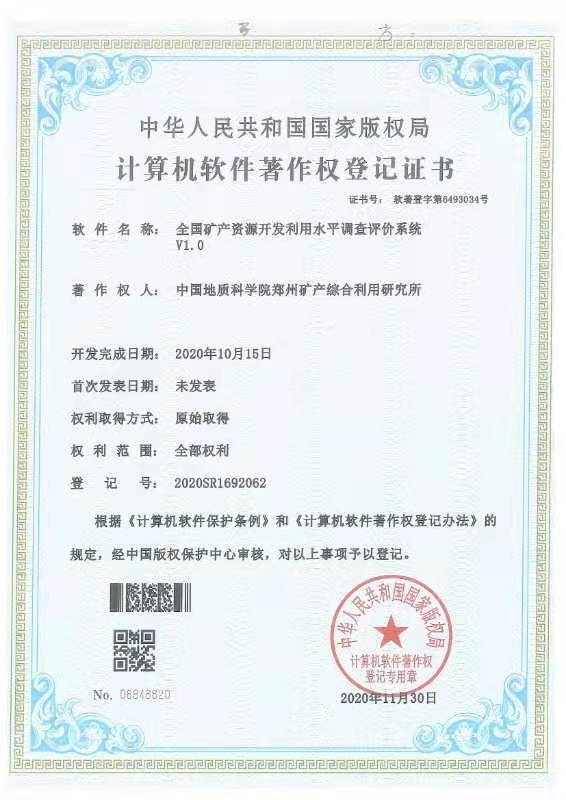 日前,自然资源部中国地质调查局郑州矿产综合利用研究所开发的“全国矿产资源开发利用水平调查评价系统”顺利获得国家版权局颁发的计算机软件著作权登记证书。